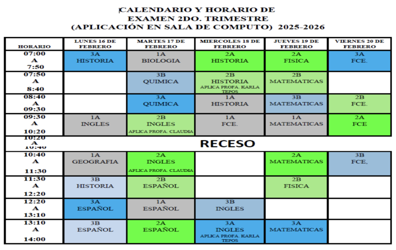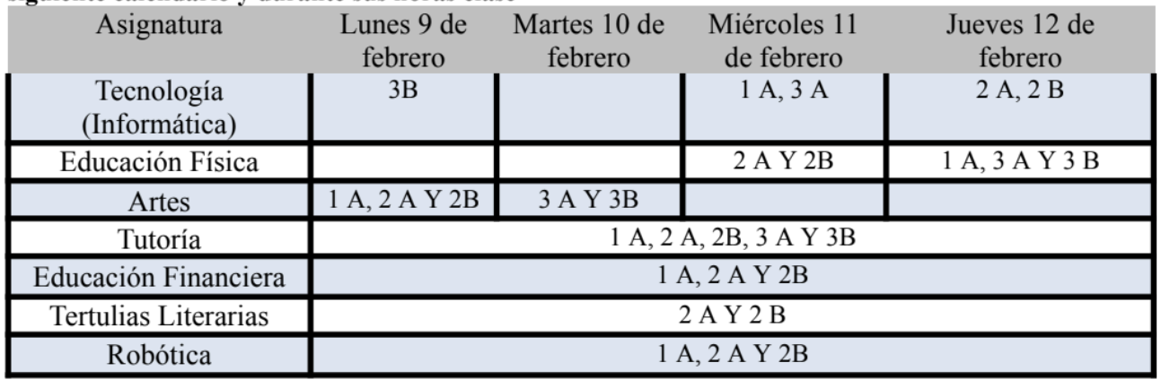 Las asignaturas de Artes, Educación Física, Tecnología, Tutoría y Materias Complementarias (Educación Financiera, Tertulias Literarias y Robótica), se estará evaluando en la semana del 9 al 12 de febrero, con el siguiente calendario y durante sus horas clase